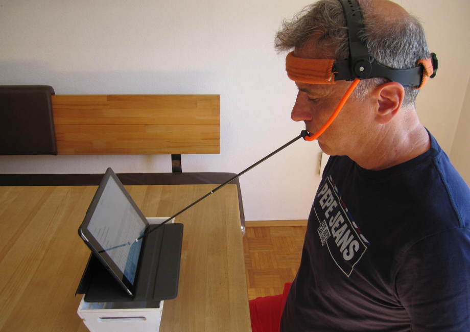 Man benötigt dazu keine Hände, man setzt das Tool auf den Kopf, richtet den einstellbaren Arm und Stab vor dem Mund oder der Stirn aus und kann sofort damit beginnen das WORLD WIDE WEB zu erkunden oder Nachrichten zu schreiben.